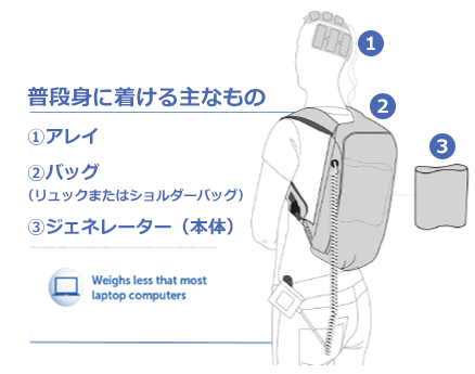 - バッテリー駆動、又は電源アダプターを使用して 24時間連続的に日常生活でご使用いただくことが可能な持ち運び可能な在宅治療用の医療機器です。