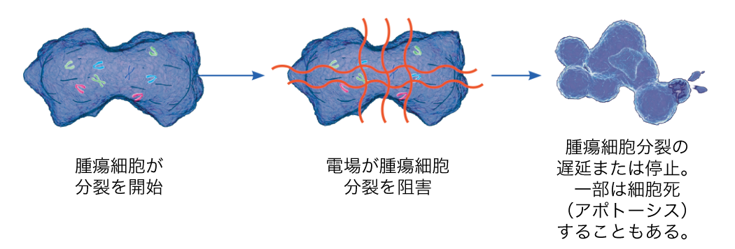 電場が腫瘍細胞の分裂を阻害します。これが腫瘍細胞分裂の遅延または停止を促し、その一部は細胞死(アポトーシス)することもあります。
