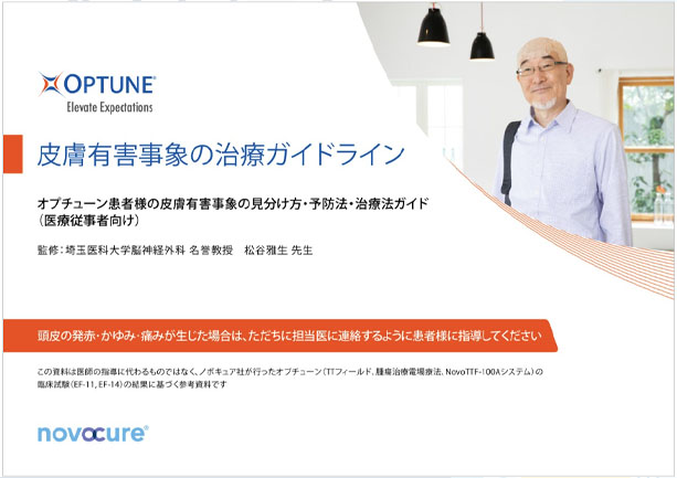 オプチューン使用に伴う皮膚有害事象の代表的な症例とその症状のグレードごとの対策を画像入りでご紹介しています。