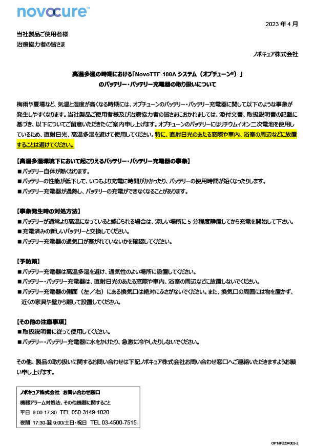 「高温多湿の 時期 における「NovoTTF-100Aシステム オプチューン®)」のバッテリー・バッテリー充電器の取り扱いについて」